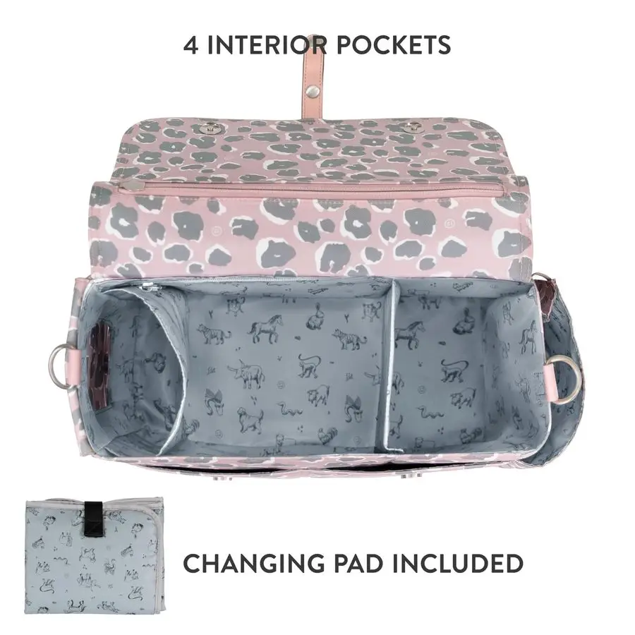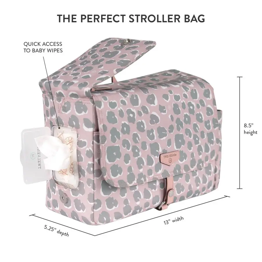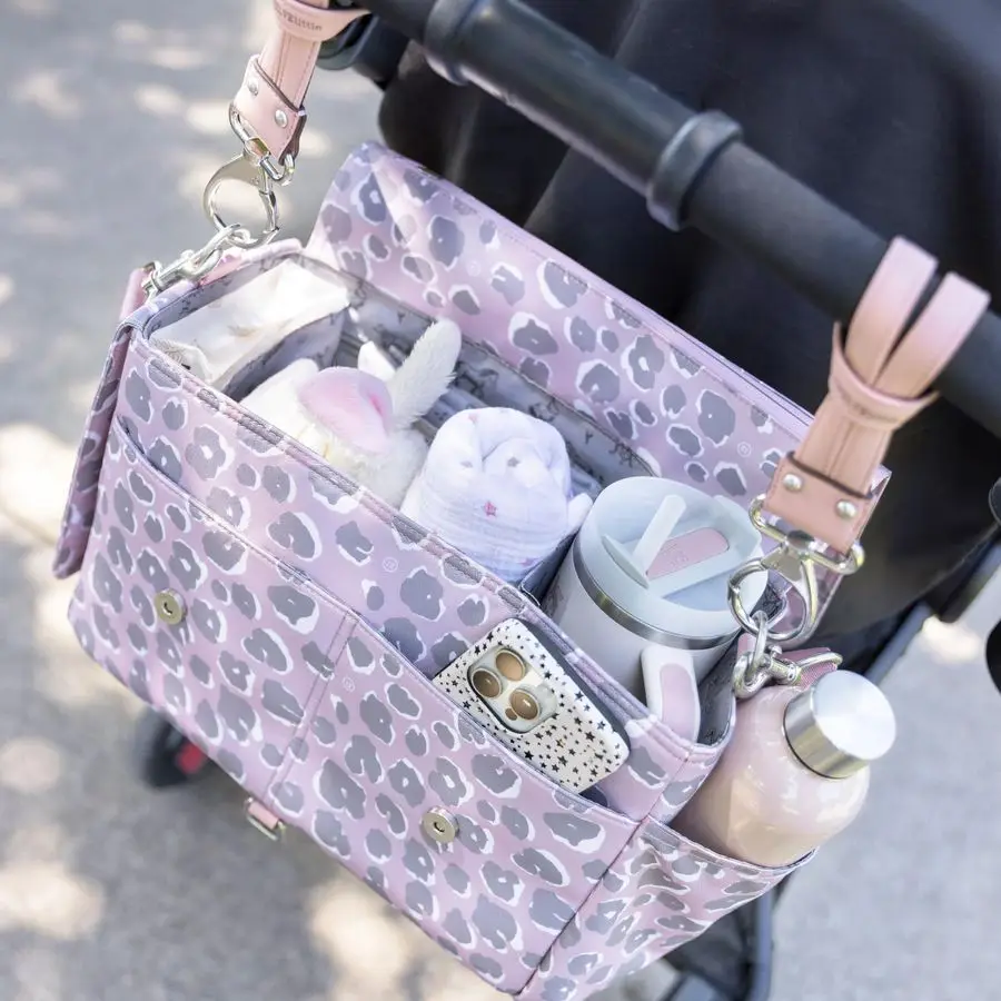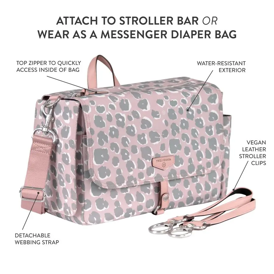 Stroller Caddy 3.0 Travel Style Diaper Bag, Messenger Diaper Bag, Includes Stroller Clips and Changing Pad Pink Leopard